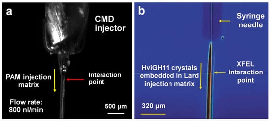 Injection of viscous medium containing the crystals at serial femtosecond crystallography (SFX) instrument at Pohang Accelerator Laboratory X-ray Free Electron Laser (PAL-XFEL). (a) Injection of polyacrylamide (PAM) injection matrix by carrier matrix delivery (CMD) injector. The original figures were obtained from a previous study []. (b) Injection of lard injection matrix by microliter volume (MLV) injector. Reproduced with permission of the International Union of Crystallography [].