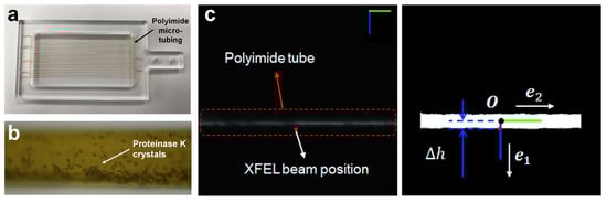 The MCC is composed of polyimide micro-tubing which is stable against various chemicals (Figure 4a). The crystal suspension was injected into the micro-tubing using a syringe []. The tubing had a thickness of 13 μm, and the background scattering generated during XFEL transmission did not affect data processing []. The inner diameter of the tubing was 100 μm, and because of the cylindrical structure of the tubing, the background scattering of the solvent was high when the XFEL passed through the center. Crystal samples placed in the tubing sink owing to gravity, and exposure of the XFEL to the bottom of the tubing results in a relatively high crystal hit rate and low solvent background scattering. Crystal samples can be seated in various orientations using a curved bottom at the bottom of the cylindrical tubing (Figure 4b) []. Because both ends of the MCC containing the crystal suspension were sealed with glue, the samples remained perfectly hydrated and problems such as crystal clogging in the injector were absent. The MCC containing the crystal was installed on an MCC mounting chip composed of an acrylic plate. The length of the tubing installed in the horizontal direction on the MCC chip was 56 mm and multiple MCCs were installed in the vertical direction. During data collection, the MCC was scanned in the horizontal direction to collect diffraction data; then, it moved in the vertical direction, and the next MCC was scanned to collect data. The MCC chip may not be perfectly aligned in the horizontal direction during mounting in the sample chamber stage. Even when these MCC chips are slightly tilted during the mounting process, the XFEL may not illuminate the micro-tubing. To overcome this tiny mis-alignment issue during the raster scanning, a fast position feedback process—a real-time visual servo method—is applied to the MCC chip (Figure 4c) []. It recognizes the MCC image and aligns the MCC chip in real time, allowing the XFEL to penetrate the MCC perfectly.