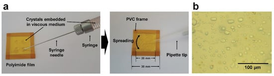 Viscous medium-based crystal support for fixed-target serial femtosecond crystallography (FT-SFX). (a) Photograph of the injection of crystals embedded in a viscous medium on polyimide film. (b) Crystals on a viscous medium based crystal support sample holder. Reproduced with permission of the International Union of Crystallography [].