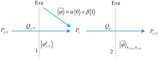 The running process of Eve performing intercept resend attack. The red dashed lines 1 and 2 indicates that Eve intercepts photons and , respectively, the blue solid line indicates transmitting photons.