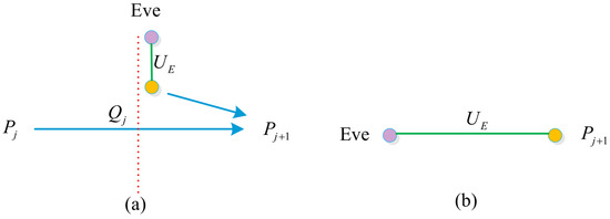The running process of Eve performing entangle measure attack. (a) Eve entangles an additional photon. (b) Eve and share an entangled state. The red dashed line indicates that Eve intercepts a photon , which is indicated by an orange dot. The purple dot indicates Eve’s additional particle . The blue solid line indicates the transmitting particle.