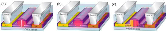 There are commonly three modulation mechanisms to manipulate electrically the free carrier concentration in plasma-dispersion-based silicon electro-optic devices: carrier injection, carrier accumulation, and carrier depletion, as shown in Figure 1 [22]. The electrical structure of a carrier-accumulation electro-optic device is a capacitor which is formed by a thin silica (SiO2) insulating layer embedded in silicon ridge waveguide. The two surfaces of the capacitor accumulate positive and negative charges, respectively, with an applied electric field. The change of the free carrier concentration leads to the change of the effective refractive index of the mode in the waveguide. The speed of the carrier-accumulation electro-optic device is usually limited by the resistance and capacitance. The electrical structure of a carrier-injection electro-optic device is a pin junction. Highly doped p-region and n-region are separated by an intrinsic region. The free carrier concentration of the intrinsic region changes with forward bias voltage, which makes the effective refractive index change. The carrier-injection electro-optic device has a simple and compact structure and high modulation efficiency, but its speed is limited by the diffusion time of carriers. The electrical structure of pin junction was used in switch design for a long time [23]. The electrical structure of a carrier-depletion electro-optic device is a pn junction working in reverse bias voltage. The depletion area of the pn junction becomes larger as the reverse bias voltage increases, which will change the free carrier concentration and then modulate the refractive index. The carrier-depletion electro-optic device is usually fast, which is the main way to realize the high-speed MZI electro-optic device, but its loss is also high. For silicon electro-optic switch applications, the electrical structure of the phase shifter mostly adopts a pin junction operated in carrier-injection mode.