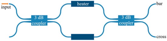 The structures of 2 × 2 silicon thermo-optic switches are mostly MZI, which consists of two 3 dB couplers and two phase shift arms, as shown in Figure 3. The commonly used 3 dB couplers in 2 × 2 MZI silicon photonic switches are directional couplers (DCs) and multimode interferometers (MMIs). DCs usually have low loss, and their power distribution ratio can be controlled easily. MMIs usually have high loss and a large footprint, but they are insensitive to polarization and fabrication errors, and they support large bandwidth. Without heating, the temperature of the two phase shifters is the same. The two beams through 3 dB couplers destructive interference at the bar port and constructive interference at the cross port, the signal outputs through the cross port. If one of the phase shifters is heated so that the optical signal passing through it has a phase shift of π, the input signal will constructive interference at the bar port and destructive interference at the cross port, and it will output from the bar port. Therefore, the ON/OFF state of a silicon thermo-optic switch can be switched by heating the silicon.