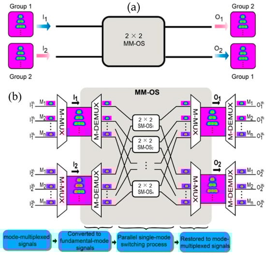 (a) General scheme and (b) detailed architecture of the proposed 2 × 2 multimode silicon thermo-optic switch. MM-OS: multimode optical switch; SM-OS: single mode optical switch; M-MUX: mode multiplexer; M-DEMUX: mode demultiplexer. Reprinted with permission from ref. [53] © The Optical Society.