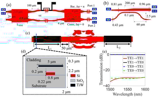 Schematic illustration of (a) the mode insensitive silicon photonic switch and (b) the mode multiplexer and demultiplexer. (c) Schematic illustration and (d) cross-section of the mode insensitive phase shifter. (e) Simulated transmission spectrum of the mode exchanger (ME). Reprinted with permission from ref. [56] © The Optical Society.