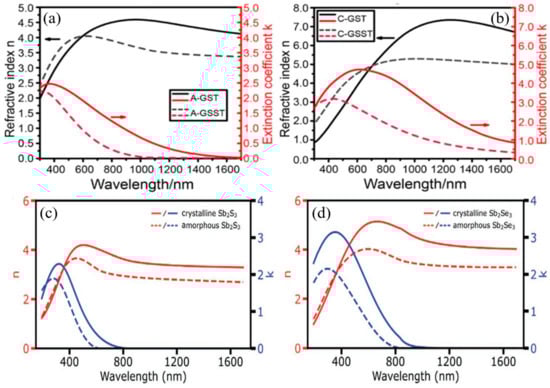 The relationships between complex refractive index and wavelength of several PCMs. (a) Amorphous Ge2Sb2Te5 (a-GST) and amorphous Ge2Sb2Se4Te1 (a-GSST) [62], (b) crystalline Ge2Sb2Te5 (c-GST) and crystalline Ge2Sb2Se4Te1 (c-GSST) [62], (c) Sb2S3 (SbS) [63], (d) Sb2Se3 (SbSe) [63]. (a,b) reprinted with permission from ref. [62] © The Optical Society.