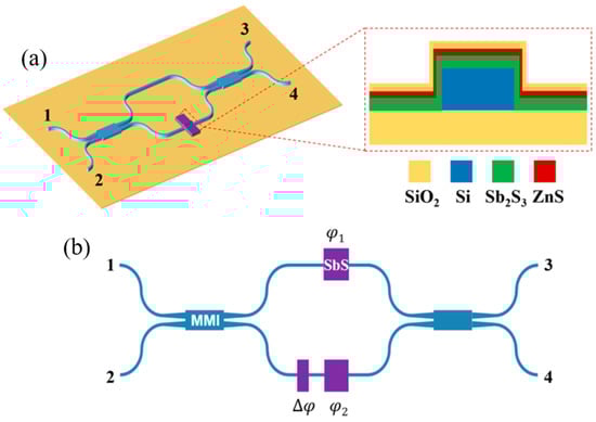 Schematics of (a) the single-drive hybrid Si-SbS integrated 2 × 2 unbalanced MZI optical switch and (b) a push-pull drive 2 × 2 SbS MZI switch. The inset in (a) shows the cross section of the Si-SbS hybrid waveguide. Reprinted with permission from ref. [74] © The Optical Society.