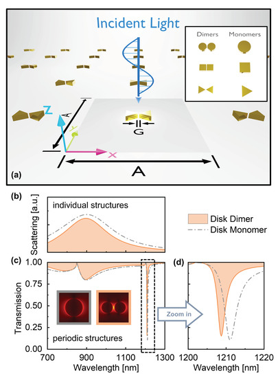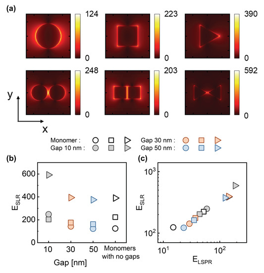 Apart from high Q factors, another long-pursuit goal in the field of plasmonics is to realize large electric field enhancement (FE), which can substantially enhance light–matter interactions [17,34,35,36,37], especially in nonlinear optical processes [38,39,40,41]. To meet the increasing demands on high-performance platforms for nanoscale optical applications, it is highly desired to combine high Q factors and strong near-FEs into one plasmonic system [34,42,43,44]. However, most of the existing works regarding plasmonic SLRs focused on the effects of their high Q factors [18,45], and it lacks investigations on the strategy of integrating large FE into plasmonic SLR nanostructures. Recently, by using a multiple elastic scattering of multipolar expansions approach, an inspiring work theoretically analyzed the properties of the electric fields caused by plasmonic SLRs [46], but their results only took account of the electric fields with wavelength-scale distances away from the plasmonic structures, and without considering that the dimers as well as shapes can help modulate the spectra and near-field distribution. Hitherto, a feasible and clear strategy is still absent for constructing a plasmonic SLR with large near-FE while maintaining high Q factors.