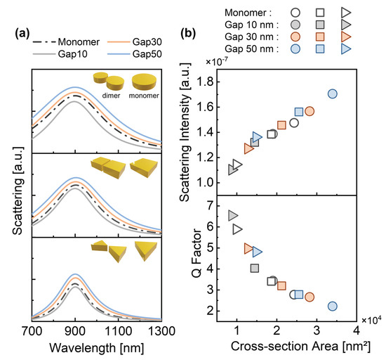 A variety of typical morphologies of particles were considered in the simulations, including disk, cuboid, triangular prism and their dimer forms with different gaps (inserts in Figure 2a), whose detailed geometric parameters are given in Table 1 and Table 2. As shown in Figure 2a, for the excited dipolar LSPRs (see Supplementary Materials, Figures S4 and S5), although the particles with different morphologies exhibit similar spectral line shapes, distinct differences lay on their scattering intensities and damping rates which are expressed by the spectral linewidths. Particularly, we found strong connections between scattering intensities and Q factors of the separated particle cells and their cross-section areas. To be specific, it is illustrated that high Q factors are achieved by adopting small (geometrical) cross-section areas of unit structures in the plasmonic array, which reduces the scattering of the corresponding LSPR. As shown in Figure 2b, despite of the differences in particle shapes, the scattering intensities of the separated particle cells are typically enlarged together when the cross-section areas of the structures increase, while their Q factors exhibit the converse behaviors. Qualitatively, such connections are because larger cross-section areas increase the areas of the structures interacting with light and enlarge the scattering efficiency, which then boosts the damping rate of the LSPRs.