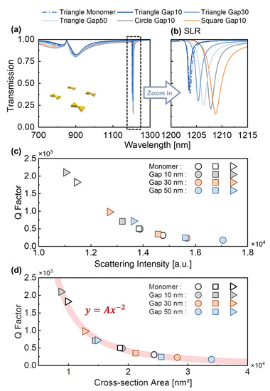 Optical response and Q factor of periodic nanoparticles. (a,b) Typical transmission spectra of periodic dimer and monomer arrays, including the shapes of circle, square and triangle. More transmission spectra can be found in Figures S1–S3. (b) The zoom-in spectra of (a). (c) The relationship between Q factor and scattering intensity. (d) The Q factors of plasmonic lattices’ SLRs with varied cross-section areas of their unit particles. The light red line is a fitting curve for (where . y and x represent Q factor and cross-section area, respectively). The representations of marker shapes and colors are shown in the legend.