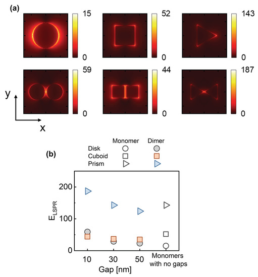 The spatial modes will then affect the FEs that can be achieved by the LSPRs. By plotting the maximum FEs of the LSPRs together (Figure 4b), it is seen that particles with sharp edges, triangular prism monomer and dimer in the presented cases, have distinct advantages in near-FE (the triangle dots in Figure 4b), which is mainly because electrons in metals are easier to gather at such sharp edges. As for the morphologies regarding square and circle, the cuboid possesses larger FE than the case of circle disk, but the circle disk dimers only obtain advantages against the cuboid dimers when the gaps are small enough (the square dots and the circle dots in Figure 4b). This is because the perpendicular edges provide the main advantages for cuboid dimers when the gaps are large; but the smaller faced areas of the disk dimers start to earn stronger advantages when the gaps become narrower, while the larger faced areas of the cuboid dimers result in fewer constraints on the motions of electrons and thus lose the advantages in field confinement. Therefore, dimers with small gaps possess higher densities of positive and negative charges coupled across the gaps, which arouses stronger field intensity [34,48].