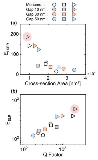 (a) Electric field enhancements of separated particles () as a function of their cross-section areas. (b) The electric field enhancements of the plasmonic SLRs of periodic particles () corresponding to their Q factors. Notably, the dot marked by the pink circle shadow presents the best performance, with up to 592 times and Q factor up to 2100.