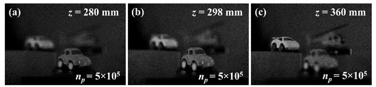 The 3D scene used in our experiment contains two toy cars and one toy helicopter [24]. These objects were placed at different distances, such as 280, 360, and 430 mm from the sensor. We note the imaging sensor size is mm and the effective focal length is 20 mm. The pitch (i.e., the distance between two consecutive sensor’s positions) is 5 mm. The results are obtained by performing simulations on an Intel® 216 CPU @2.10 GHz (2 processors) with 256 GB RAM. The software used is Spyder integrated development environment from Anaconda Navigator.