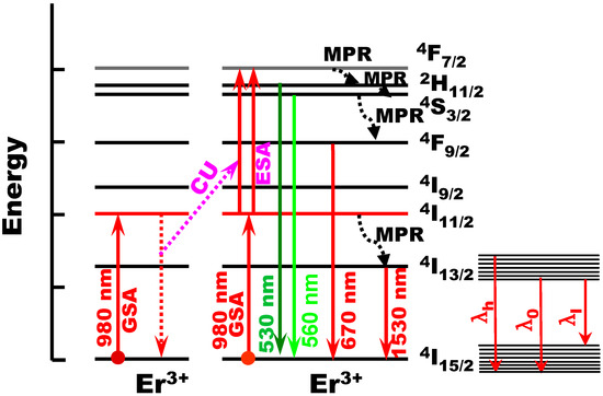3.2. Er3+ Emission Characteristics and 980 nm Upconversion Mechanism