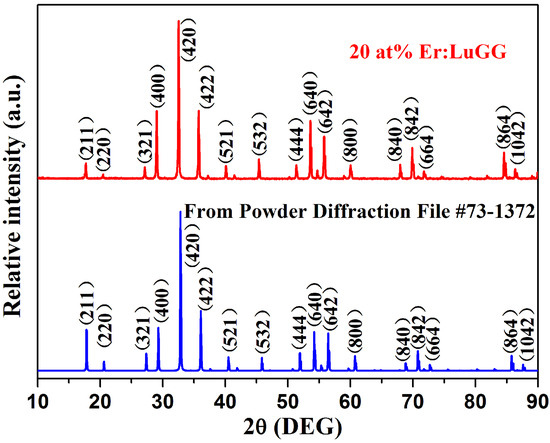 We note that, although the erbium-doped LuGG crystal has an erbium concentration as high as 20 at%, its X-ray diffraction pattern does not reveal a noticeable difference from that of the undoped crystal. This is due to the larger admittance of lanthanide ions in the lattice of a garnet, as mentioned in the introduction. The argument is verified by the fact that the Er3+ ion in the Lu3Ga5O12 single crystal has a segregation coefficient of ~1.0. This is because Er3+ and Lu3+ ions have close ionic radii: 0.881 Å for Er3+ and 0.848 Å for Lu3+, which cause less mismatch in the lattice. A segregation coefficient of ~1.0 means that the Er3+ concentration in the grown crystal has good uniformity, and hence the Lu3Ga5O12 has excellent admitting capability of Er3+ and is a good host material for Er3+ dopants.