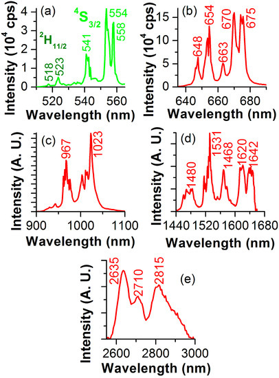 Figure 3a–d shows the measured emission spectra of the electronic transitions 2H11/2 ↔ (530 nm), 4S3/2 ↔ 4I15/2 (560 nm), 4F9/2 ↔ 4I15/2 (670 nm), 4I11/2 ↔ 4I15/2 (1020 nm), and 4I13/2 ↔ 4I15/2 (1530 nm) of erbium ions in the LuGG crystal. Figure 3e shows the spectrum of the mid-infrared emission at 2.8 µm, which involves a transition between two intermediate states, 4I11/2 and 4I13/2. The main emission peaks are indicated for each transition. The spectra of visible emissions at 530, 560, and 670 nm were recorded under the 980 nm wavelength excitation. These spectra originate from upconversion emissions. For the two green emissions, the spectral region of <535 nm concerns the transition 2H11/2 ↔ 4I15/2 and that of >535 nm involves the 4S3/2 ↔ 4I15/2 transition. The most remarkable feature of the three visible upconversion emissions is that the red emission has a maximum intensity nearly four times larger than the green emission at 560 nm, and the 560 nm emission has a maximum intensity approximately one order of magnitude larger than another green emission at 530 nm, as shown in Figure 3a,b, which were recorded under the completely same experimental condition. For the two near-infrared emissions, typical Er3+ emission spectra were recorded at the 1.0 and 1.5 µm regions. The potential lasing wavelengths there include 1023, 1531, 1568, 1620, and 1642 nm. At the 2.8 µm spectral region, three peaking emissions at 2635, 2710, and 2815 nm could be resolved, as shown in Figure 3e. Among them, lasing at the latter two wavelengths has been demonstrated [1].