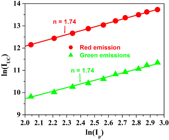 To understand the upconversion mechanism, the upconversion emission intensity (IUC) was measured as a function of the density of pumping power (IP). The upconversion emission intensity IUC and the pump power IP obey the following power relationship: IUC ∝ (Ip)n, where n is the power index that determines the number of photons required to realize a specific radiative transition. The integrated intensity of each emission band on the logarithmic scale, ln(IUC), is calculated and plotted against the 980 nm excitation beam intensity on the logarithmic scale, ln(Ip). The results are shown in Figure 4. The green balls concern the two green emissions 2H11/2 ↔ (530 nm) and 4S3/2 ↔ 4I15/2 (560 nm), and the red balls involve the red emission 4F9/2 ↔ 4I15/2 (670 nm). A linear fit was performed on each plot, and the slope obtained from the linear fit yields the value of the power index n. The resultant n values are indicated in Figure 4. Good fitting is obtained for each case. The fits give the same n value of 1.77 for both the green and red emissions. The n value suggests that the two-photon process is the dominant mechanism for the 980 nm upconversion emissions of the erbium-doped LuGG crystal studied here. The two-photon process responsible for the upconversion emissions concerns the CU and ESA, as indicated in Figure 1. As demonstrated below, the energy transfer CU process would be more likely for the excitation of the 2H11/2 and 4S3/2 states in the highly erbium-doped LuGG crystal studied here.