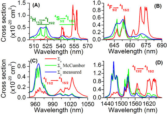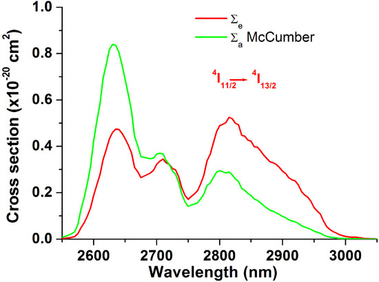 Based on the emission spectra shown in Figure 3a–d, we have computed using Equations (1) and (2) the ECS (red) and ACS (green) spectra of the transition processes 4I15/2↔4S3/2 (0.56 μm), 4I15/2↔ 2H11/2 (0.53 μm), 4I15/2↔4F9/2 (0.67 μm), 4I15/2↔4I11/2 (1.0 μm), and 4I15/2↔4I13/2 (1.5 μm) of erbium-ion in the LuGG crystal. The calculated results are shown in Figure 5. Due to the linearity between the ECS Σe(λ) and the emission intensity ξ(λ) as shown in Equation (1), each ECS spectrum in Figure 5 has little difference from the corresponding emission spectrum shown in Figure 3. The ECS error originates predominantly from the uncertainty of Prad. Juud-Ofelt analysis yielded a relative uncertainty of 18.1%, 13.7%, and 13.4% for the radiative transitions 4F9/2↔4I15/2 (0.67 μm), 4I11/2↔ 4I15/2 (1.0 μm), and 4I13/2↔4I15/2 (1.5 μm), respectively, and an effective error percentage of 14.4% for the two processes 2H11/2↔4I15/2 and 4S3/2↔4I15/2 [2]. The incertitudes of ACS Σa(λ) can be computed from the known incertitude of Σe(λ) and EE on the basis of Equation (2). The uncertainty percentage is given by