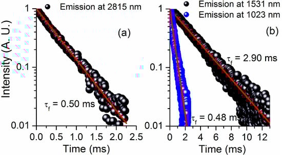 Transient decaying curves of NIR or mid-IR emissions at (a) 1023 (blue balls), 1531 (black balls), and (b) 2815 nm (black balls) of erbium ions (20 at%) in LuGG garnet crystal. The red solid lines represent the fitting results of a mono-exponential trial function.