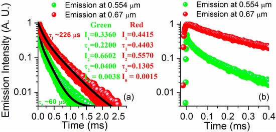 The two temporal traces in Figure 8a were fitted using Equation (5). The best fits are shown by black curves, and the relevant fitting parameters are presented. We note that the values of τ1 and τ2 are 220 ± 5 and 40 ± 2 μs for the green fluorescence at 0.554 μm and 440 ± 8 and 130 ± 3 μs for the red fluorescence at 0.67 μm. The ground I0 is below 0.4% and ignorable. The values of I1 and I2 are (34 ± 5)% and (66 ± 10)%, respectively, for the green fluorescence at 0.554 μm and (44.0 ± 7)% and (56.0 ± 8)%, respectively, for the red fluorescence at 0.67 μm. It can be seen that the I1 (I2) value of the 0.554 μm fluorescence may be thought to be identical to that of the 0.67 μm fluorescence within the incertitude.
