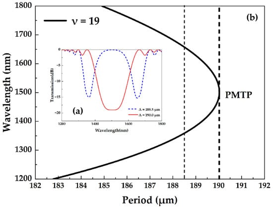 where is the effective refractive index of the fiber core mode, is the effective refractive index of the cladding mode, and Ʌ is the grating period. In a certain wavelength range, the coupling between the fundamental and higher-order cladding modes can produce the dual peaks for the LPFG [18]. Figure 2 shows the phase-matching curves and transmission spectra of the 19th cladding mode. The phase-matching curve has only one intersection with a line of a 190.0 μm period, which is the phase-matching turning point (PMTP), and the LPFG operates at the PMTP with only one resonant peak. As the period decreases, the single peak splits into dual peaks in opposite directions. When the period is reduced to 188.5 μm, the dual peaks shift to 1364 nm and 1654 nm. At this point, the LPFG operates in the dual-peak resonance near the PMTP and has a higher corresponding sensitivity to axial force. Therefore, a period of 188.5 μm was chosen to analyze the transmission spectrum of the LPFG.