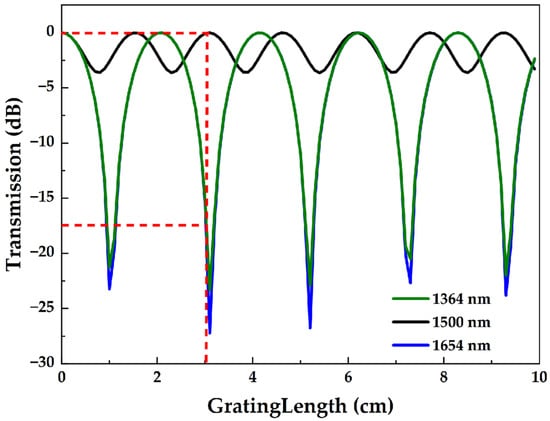 The position of the resonant peak is determined by the grating period, while the amount of loss in the resonant peak is determined by the grating length. Figure 3 shows the variation curve of transmittance with the grating length. It can be seen from the figure that the two resonant peaks can reach the full coupling state when the grating length is 1 cm, 3.1 cm, 5.2 cm, etc., and the central wavelength between the two peaks is at the position of 1.5 cm, 3 cm, 4.6 cm, etc., without loss. To ensure that there is no loss at the central wavelength between the two peaks and that the position of the two peaks is fully coupled as far as possible, a grating length of 3 cm is selected to analyze the LPFG transmission spectrum.