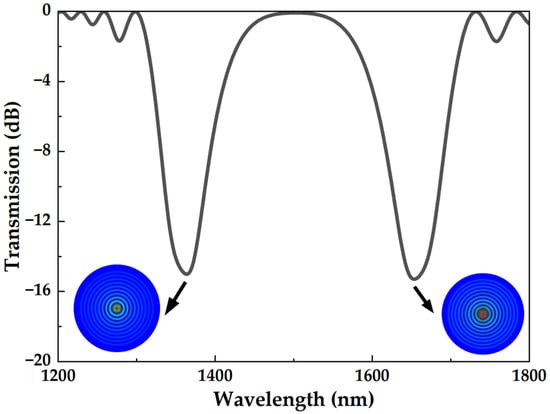 When the phase-matching condition is satisfied, the cladding mode is excited at the resonant wavelength and decays rapidly, resulting in a resonant peak, as shown by the red solid line in Figure 2a. The phase-matching condition for the LPFG can be expressed as [22]