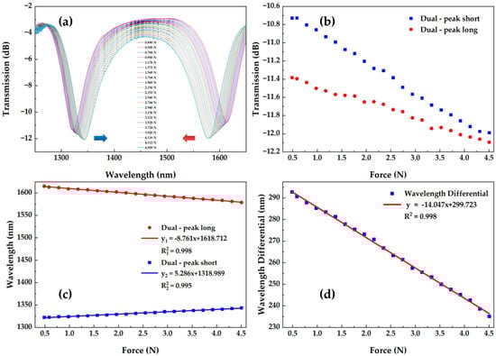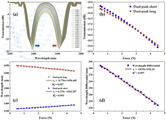 Figure 7a shows the transmission spectra under different axial forces of the sensor. Additionally, as the force increases, the loss and wavelength of the resonant peak will change. Figure 7b,c shows the peak wavelength and the relationship between loss and force, respectively. It is shown that the short-wavelength resonant peak undergoes a red shift, while the long-wavelength resonant peak undergoes a blue shift, meaning that the two peaks are getting closer to the center wavelength. Additionally, the losses decrease with the increase in axial force. Therefore, the evidence shows that long-wavelength resonant peaks have a higher force sensitivity than short-wavelength resonant peaks, which is highly consistent with the results of our simulation. Figure 7d shows the scatter plot and fitting curve of the wavelength difference between the two resonant peaks. The high sensitivity of the LPFG axial force sensor is −14.047 nm/N, and the ultra-linearity of the fitted curve is 0.997, indicating a good linear relationship. This indicates that compared to general LPFG force sensors, the dual-peak LPFG has higher responsiveness and linearity with a small force.