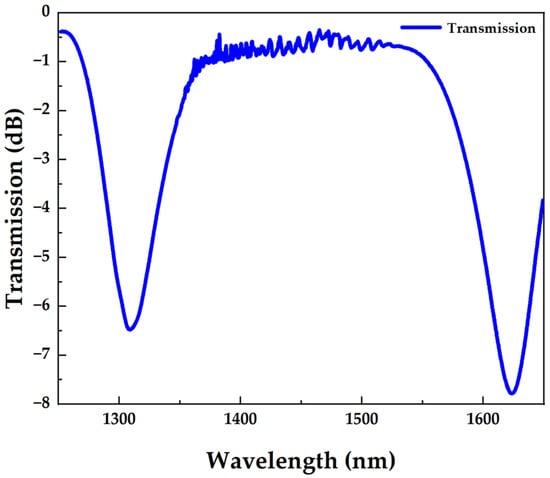 Based on the above simulation calculations, we manufactured a dual-peak LPFG axial force sensor with a grating period Ʌ of 185.9 um and a grating length L of 20.6 mm, which was fabricated by using the point-by-point inscription technique with a 213 nm ultraviolet laser (IMPRESSS 213, XITON). The pulse energy and exposure time were 135 mW and 15 s, respectively. The SMF (SM-28, Corning) used in the experiment before fabricating the LPFG was hydrogen-loaded in advance for two weeks at 120 °C and 12 MPa and was annealed at 100 °C for 12 h to improve thermal stability. Its spectral transmission is shown in Figure 6. The theoretical simulation results are similar to the experimental manufacturing results.
