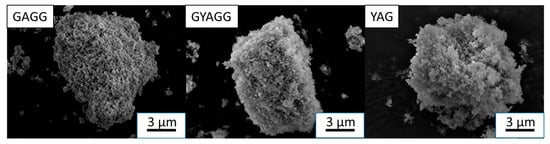 SEM images of representative powders: GAGG:Ce (Ref.1), GYAGG (Ref.2) and YAG (Ref.4) particle agglomerates after calcination at 1000 °C.
