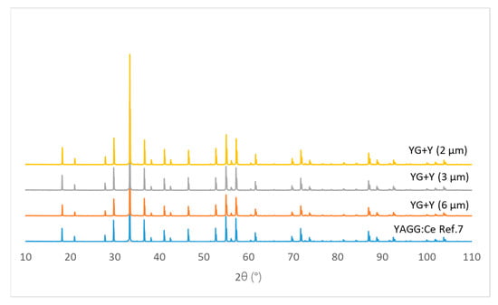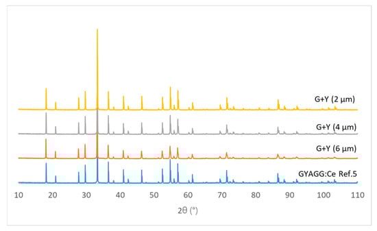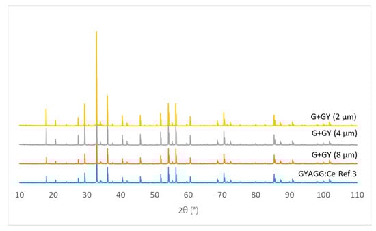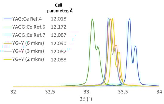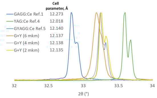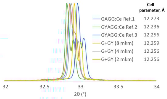 The resulting ceramic samples were single-phase with a garnet structure. Figure 2 shows the X-ray diffraction patterns of the samples from Series 1. Details of the X-ray diffraction pattern in the vicinity of the major reflex in the interval 2θ from 32 to 34 (°) are shown in Figure 3. Inset shows the calculated lattice parameters. The reflections of the compounds obtained by mixing are positioned in the interval between the mixed compounds, as expected. At the same time, the reflection for the GYAGG:Ce Ref3 sample is closer to the reflection of the GAGG:Ce Ref1 sample, since the gadolinium index in this compound X = 2.2 and exceeds that for GYAGG:Ce Ref2 (X = 1.5). The position of the peak of the major reflection measured in samples obtained from mixtures was slightly dependent on the granulometric composition of the mixed powders. The larger the median particle size, the closer the reflection of such a sample was to the reflection of the sample obtained by coprecipitation.