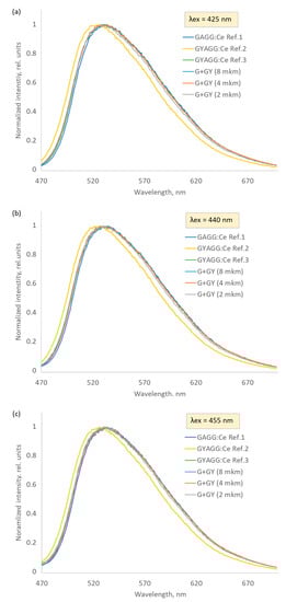 It has been proven that the luminescent properties of ceramics also do not depend on the granulometric composition of the mixture components used (Figure 8, Figure 9 and Figure 10). A similarity of the spectra of the samples obtained by mixture also implies that, in a relatively short period of time, the case occurs when a disordered compound with a uniform and random distribution of cations in the crystal lattice forms. This also extends to impurity Ce3+ ions and indicates that the crystallites of the compounds used for the mixture are completely diluted, and the composition of the compound is averaged. This is a rather remarkable fact, since the uniformization of the composition occurs without melting the crystalline mass. Obviously, varying the weight fractions of the components selected for mixing makes it possible to control the position of the luminescence band maximum. Furthermore, in ceramic samples based on yttrium (Series 3) and lacking gadolinium, a sufficiently large tuning range of the luminescence band maximum ~40 nm can be obtained.