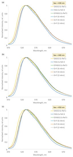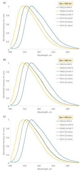 Figure 8, Figure 9 and Figure 10 show the luminescence spectra of the samples from Series 1–3 upon excitation in the region of the first interconfigurational transition of Ce3+ ions. The excitation was carried out both at the maximum of the band, and at wavelengths on the long-wavelength and short-wavelength wings of the band, corresponding to this transition. All series showed a similar result: the luminescence bands of the samples obtained from mixtures were located between the spectra of the mixture components. Moreover, the spectra coincide with those of the samples obtained by coprecipitation and do not depend on the granulometric composition of the mixed components.