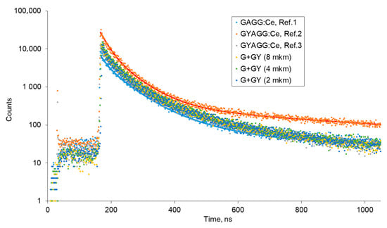 - Korzhik, M.; Alenkov, V.; Buzanov, O.; Dosovitskiy, G.; Fedorov, A.; Kozlov, D.; Mechinsky, V.; Nargelas, S.; Tamulaitisd, G.; Vaitkevičiusd, A. Engineering of a new single-crystal multi-ionic fast and high-light-yield scintillation material (Gd0.5–Y0.5)3Al2Ga3O12:Ce,Mg. CrystEngComm 2020, 22, 2502–2506. [Google Scholar] [CrossRef]