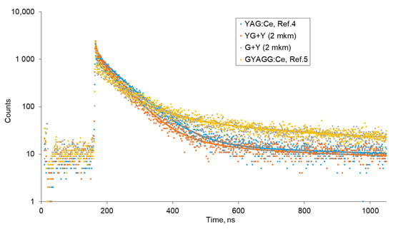 Scintillation kinetics were measured with a 22Na source by the start-stop method with XP2020 photomultipliers in both channels, providing a response function width (FWHM) of 1.2 ns. All measurements were performed at room temperature. The relative light yield (LY) in the series was evaluated by the measurement of the full absorption peak position of 241Am alpha-particles, as used for the measurements with translucent or powdered samples in [28]. A Y3Al5O12:Ce (YAG) single crystal of 1 mm thickness, with ground surfaces and an LY of 20,600 ph/MeV(under gamma-quanta), was chosen as a reference sample. The errors in light yield measurements were defined as ±2%, whereas the fitting results for decay constants were ±2 ns, correspondingly. It was assumed that the alpha/gamma ratio of studied samples was the same.