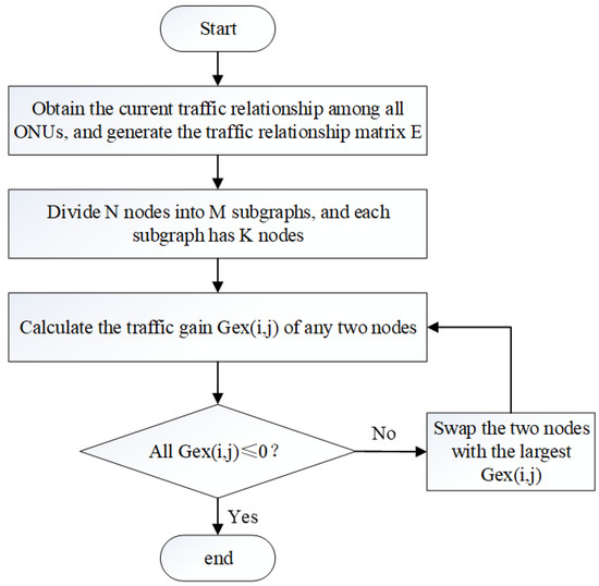 Figure 3 shows the flow of the algorithm. The SDN controller firstly obtains the communication relationship between all ONUs through the MAC table of OLTs, and generates the traffic relationship matrix E between them. Then, it divides all ONUs into M subgraphs, and each subgraph has K nodes. It should be noted that, in real life, all ONUs have been configured before the controller obtains information, and the current OLT to which it links to can be known. The initial state is M subgraphs. Therefore, there are two methods for the SDN controller to divide all ONU nodes into M subgraphs. One is to directly use the obtained M subgraphs as the initial state to calculate, the other is to disarrange all the nodes and randomly generate M subgraphs as the initial state. Due to the randomness of the arrival of new traffic, the initial state of the two methods is essentially random and both can be used. However, the former is recommended to be used because it does not need to re-randomize, which can reduce the amount of computation of the controller and save computing resources. After G(V,E) is divided into M subgraphs, the controller calculates the Gex(i,j) of any two nodes in all the M subgraphs and swaps the two nodes with the largest Gex(i,j) until all Gex(i,j) are less than or equal to 0. The subgraph to which the two nodes swapped in each loop belong is not immutable. Finally, the SDN controller converts the calculated results into instructions using the Openflow protocol and sends them to OLTs, and OLTs inform ONUs to switch wavelength for slice reorganization.