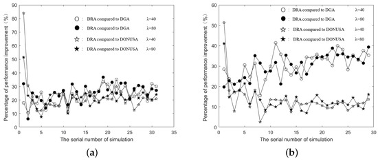 (a) Improved performance of DRA compared to DGA and DONUSA with 8 OLTs; (b) improved performance of DRA compared to DGA and DONUSA with 16 OLTs.