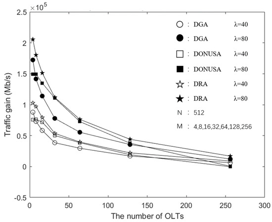 Figure 4 shows the traffic gain of 3 algorithms with 8 and 16 OLTs, and Figure 5 shows the improved performance of DRA compared to DGA and DONUSA with 8 and 16 OLTs. Hollow nodes are results at = 40 Mbs, and the solid nodes are results at = 80 Mbs.