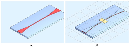 The proposed sensor is a waveguide-based plasmonic refractive index sensor with a direct interface between a metallic layer and waveguiding core. The material platform Si3N4/SiON was chosen, due to its transparency for visible wavelength range as well as tunability of refractive index which proves to be a key parameter in the design of this sensor type. The 3D structure of the sensor is shown in Figure 1 for both pure waveguide design with coupling tapers and after gold layer deposition and passivation. It consists of a multimode waveguide with a cross-section of 8 × 8 µm2, input and output taper and a gold layer 5 mm long and 45 nm thick.
