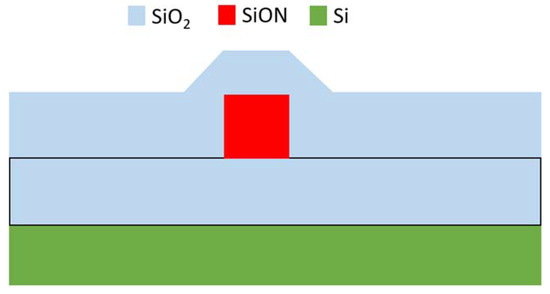 The cross-section of the proposed material platform is shown in Figure 2 where a silicon wafer was chosen as a substrate for the device, on top of which the SiO2 buffer layer with a thickness of 6–10 µm is expected to be grown by available methods like plasma enhanced chemical vapour deposition. On the top of the buffer layer, SiON material is expected to be grown using the same growth method, while adjusting the parameters to obtain desired refractive index. Finally, the whole waveguide is to be passivated by a thick layer of SiO2 to prevent analyte’s interaction with the non-sensing part of the waveguide.
