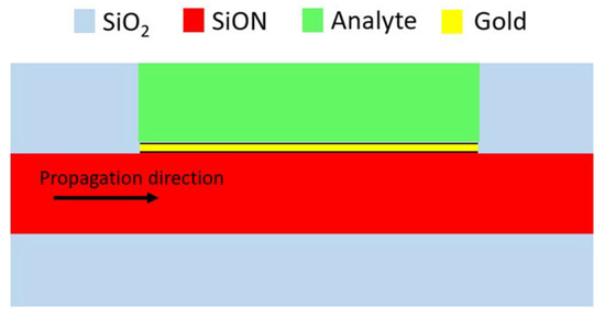 The final structure of the sensor consisting of four distinct layers is shown in Figure 3, with the SiO2 cladding layers (n = 1.46) thick enough to optically separate the waveguiding layer from the Si substrate and environment, waveguiding layer (SiON), and a gold layer on top of core in the sensing part. Gold has been chosen as the metallic layer due to its strong plasmonic resonance capabilities combined with chemical stability in various environments.