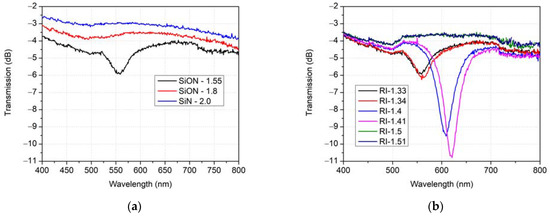 According to the work of Čtyroký et al. [19] for this type of sensor, due to its underlying physical principle the position and attenuation of a dip in a spectrum are highly dependent on both refractive indices of an analyte, as well as the waveguiding core. Therefore, in order to maintain good sensitivity with spectral dip occurring in visible wavelengths, the sensor must consist of a waveguiding core with a refractive index similar to the refractive index of the analyte This hypothesis is verified in Figure 4, where spectral characteristics of transmission through the proposed waveguide sensor are shown. The refractive index of the analyte for this investigation was chosen to represent water-based solutions, e.g., n = 1.33. As a light source, a 50 µm wide beam with a Gaussian profile was chosen to represent direct coupling with multi-mode fibre and to neglect the offset for the possibility of lacking excitation for some modes, due to the fibre position. While transmission spectra of waveguide cores with refractive indices of 2.0 (pure Si3N4) and 1.8 (SiON) do not exhibit any differentiable dip, for the waveguiding core with a refractive index of 1.55 (still well in the range of possibilities of SION material platform [20,21]) the spectrum exhibits strong dip between 500 and 600 nm of wavelength. Such core was used to analyse the influence of the analyte’s index of refraction variation with a significant shift corresponding to the change. Figure 4b shows also the increased sensitivity of a sensor with a refractive index of core 1.55 proving the verity of the rule concerning analyte and core refractive index matching. It points out increased sensitivity for aqueous solutions while showing the prohibition of the use for analytes with RI above 1.5 due to confinement constraints. For these initial simulations, a SiON waveguide with (8 × 8) µm2 profile with a 45 µm thick gold layer was used.
