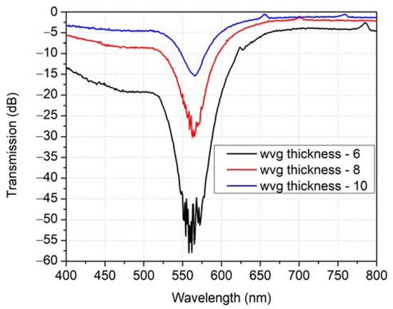 Simulation results of transmitted power spectra for waveguide thickness of 4 µm, 6 µm, and 8 µm and aqueous analyte of RI = 1.33.