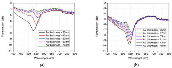 Simulation results of transmitted power spectra for structures with varying gold layer thickness: (a) for a wider range of gold thicknesses; (b) for a smaller range of gold thicknesses.