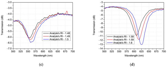 To maintain fabrication simplicity as well as minimize the amount of optimization necessary for sensor fabrication, the selected parameters of gold layer and waveguide thickness were kept unchanged for all following sensor variations. Consequently, two SPR sensors suitable for detection of different liquid analytes are proposed, with the only difference being the refractive index of their respective cores, as the two optimal values of the core’s RI 1.55 and 1.8 were chosen with the aim of covering all the liquid analytes with refractive indices from 1.3 to 1.6 (liquid analytes with RI of 1.2 to 1.3 are rarely used; however, if the necessity arises, sensitivity for them can still be obtained by proposed sensor structure). Their transmitted optical power spectra for different refractive index ranges are shown in Figure 8.