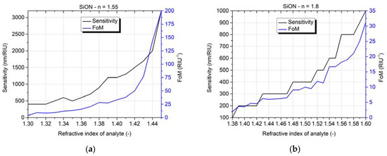The result shows that the two proposed sensors are able to cover range of analytes with a refractive index from 1.3 to 1.6. The first sensor with a refractive index of core 1.55 offers sensitivity for RI from 1.3 to 1.44. The upper limit stems from the spectral dip minimum being too wide to be accurately determined. This constraint might be overcome by shortening the gold layer length, at the cost of losing sensitivity for lower refractive indices. The second proposed sensor with a core RI of 1.8 covers the rest of possible liquid analytes with a sensitivity from 1.38 to 1.6. As shown in Figure 9, the potential achievable sensitivity of the sensor is more than 3000 nm/RIU, and Figure of Merit obtained from simulations was more than 200 RIU−1. This value matches commonly used waveguide and SPR-based refractive index sensors in terms of sensitivity and even overcomes them in terms of Figure of Merit [22,23]. In addition, its multimode character offers the possibility of a relatively long sensing structure with relatively low attenuation to provide ease of use in a non-lab environment. The proposed sensor’s potential sensitivity is more than four times higher than Bragg gratings [24], silicon [25], and MIM structures [22] while boasting also comparable or even higher FoM. Higher sensitivity was usually proposed only using more complex structures like ring resonators [22] or by the introduction of multi-stack layers into the design [15] which might also be a possible future area of research for the sensor proposed in this paper.