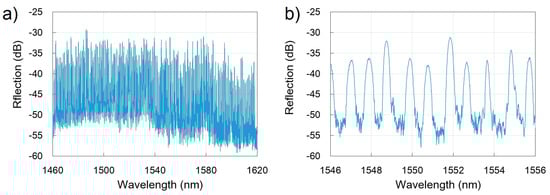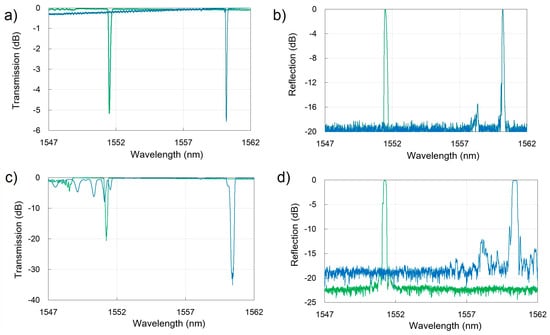 Figure 2a,b, the transmission and reflection spectra of Type-I TTC gratings fabricated in the 125 μm and 50 μm diameter fibers are denoted by the green and blue traces, respectively. The holographic phase mask with a 1.07 µm pitch typically produces a nominal Bragg resonance wavelength of 1550 nm in standard telecommunication fibers such as SMF-28. In the case of the 125 µm diameter Fibercore fiber, the Bragg resonance wavelength was approximately 1551.4 nm. When written with the same phase mask, the Bragg wavelength of the gratings written in the 50 µm diameter fiber was longer than the Bragg wavelength of the gratings in the 125 μm diameter fiber. Indeed, the core diameter reduction is achieved by increasing the Ge doping levels of the fiber core, which, in turn, increases its effective index and hence creates a Bragg resonance at a longer wavelength for a given grating pitch. The higher Ge doping level associated with core reduction also increases the photosensitivity of the fiber to ultrafast infrared radiation [