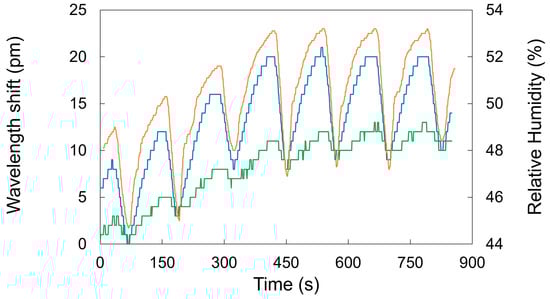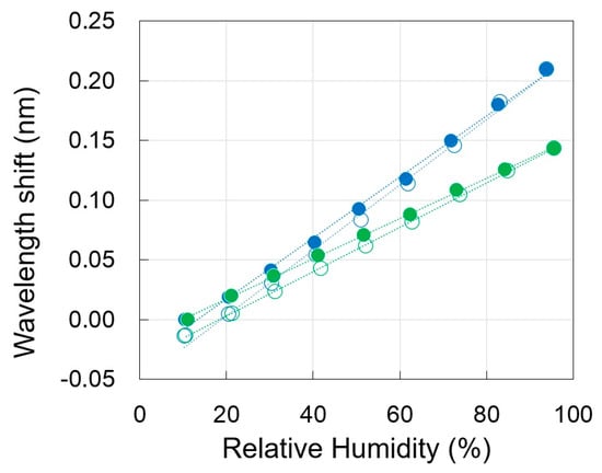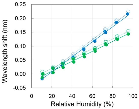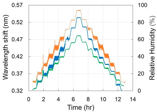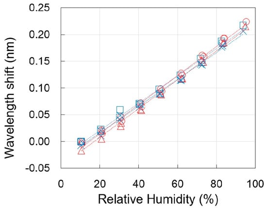 Figure 3, where the wavelength shift for a given constant RH is averaged over 10 min, the variations in wavelength shift versus RH as a function of fiber type and refractive index change type (i.e., Type-I or Type-II) can be obtained. When measured at room temperature, the RH within the humidity chamber was not stable. The wavelength-shift measurements as a function of RH were performed at constant temperatures of 40 °C and 60 °C, as the maximum temperature for the Omega RH meter was limited to 60 °C. An example sensitivity plot of the wavelength shift versus RH of four Type-II devices, two in 50 µm and two in 125 µm diameter fibers, taken at 60 °C is presented in
