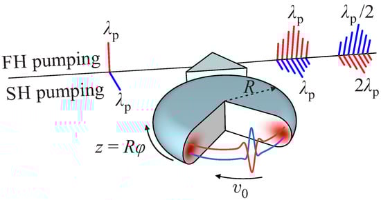 The transfer of the soliton–comb concept to the microresonators, which possess the lower second-order nonlinearity, promises further lowering of the pump power, entering of new spectral ranges, and new attractive operation regimes; see also below. This transfer cannot be straightforward because of the specific and important features inherent in the nonlinearity []. In contrast to the case, elementary nonlinear processes involve not four but three light quanta. These processes are the thresholdless generation of the second harmonic (or sum frequencies) and the inverse threshold process of parametric oscillation. The comb generation can be viewed as a cascade of these processes. Running them requires the employment of the phase matching (PM) for the first harmonic (FH) and second harmonic (SH) resonator modes. The PM conditions in the microresonators can in turn be either natural, relevant to certain light wavelengths, or artificial using the so-called radial poling [,,,,]; see also below.