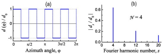 The radial poling enables one to adjust the phase matching to practically any desirable spectral point with no effect on the linear properties. In polar materials, such as LN, the largest components of the quadratic susceptibility tensor, and , change sign under the inversion of the spontaneous polarization. The periodic radial poling results in the periodic sign changing for any of these components, as illustrated schematically by Figure 3a. Let d have the absolute value . The periodic sign-changing function can be represented then by the Fourier series